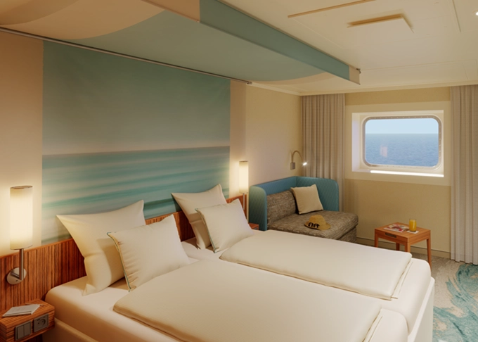 | CA - Vonkajšia kajuta PREMIUM / obmedzený výhľad 14-16,5 m². Neotvárateľné okno / obmedzený výhľad. 6. paluba. Max 2 osoby. Cenový model Premium. | 1 780 € 890 € za osobu | ||