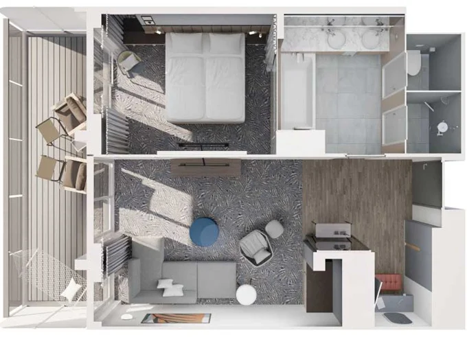 | JKBO - Junior Suite s balkónom B 26 m² + balkón 7 m² so stoličkami a podnožkami. 8-12. paluba. Max 4 osoby. Výhody Junior Suite. | 4 098 € 2 049 € za osobu |